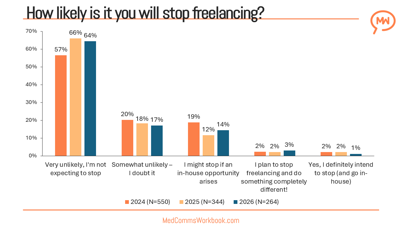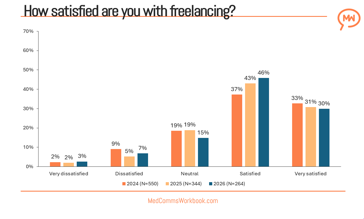 Freelancers in MedComms appear to be navigating a paradox: they are increasingly satisfied with the work they do and unlikely to stop, yet uncertainty remains about what the future holds for freelancers. The 2025 data suggest an industry in transition, one where satisfaction is high, confidence is fragile, and long‑term sustainability will depend on the next stage of industry evolution.